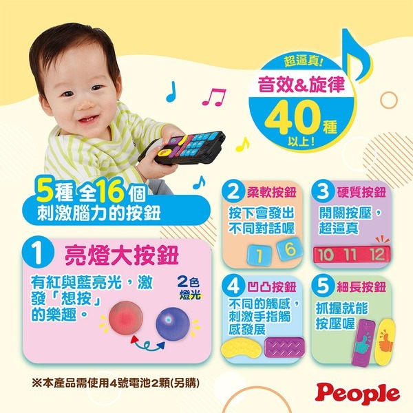 兼具「仿真實物」、「趣味性」,充滿豐富音效及5種智育按鈕的搖控器誕生了!媽媽跟寶寶都超滿足!