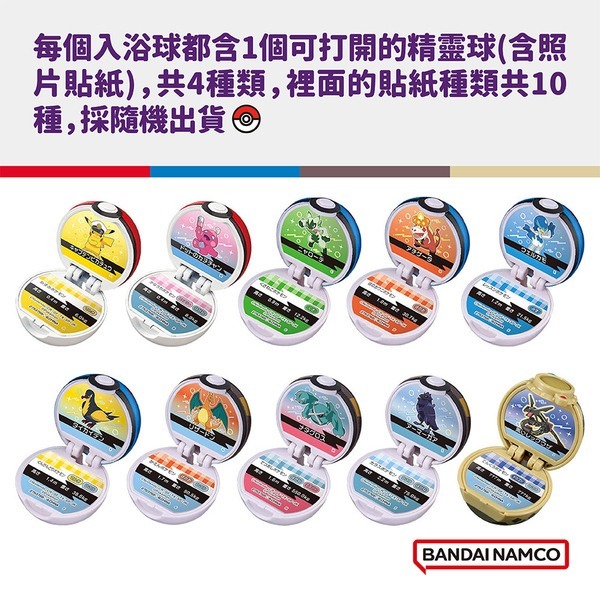 每個入浴球都含1個可打開的精靈球(含照片貼紙),共4種類,