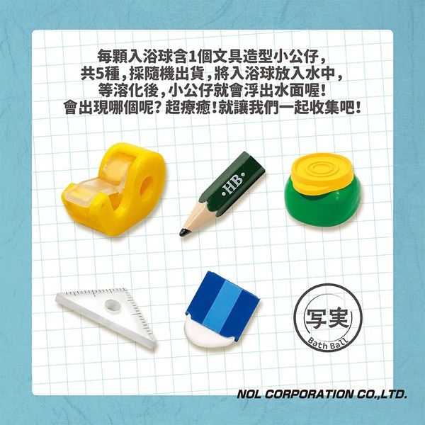 每顆入浴球含1個文具造型小公仔,共5種,採隨機出貨,