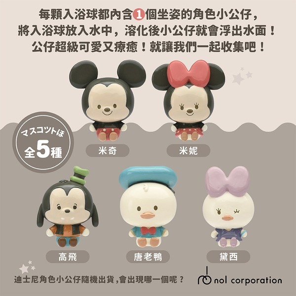 每顆入浴球都內含1個坐姿的角色小公仔,共5種,採隨機出貨!