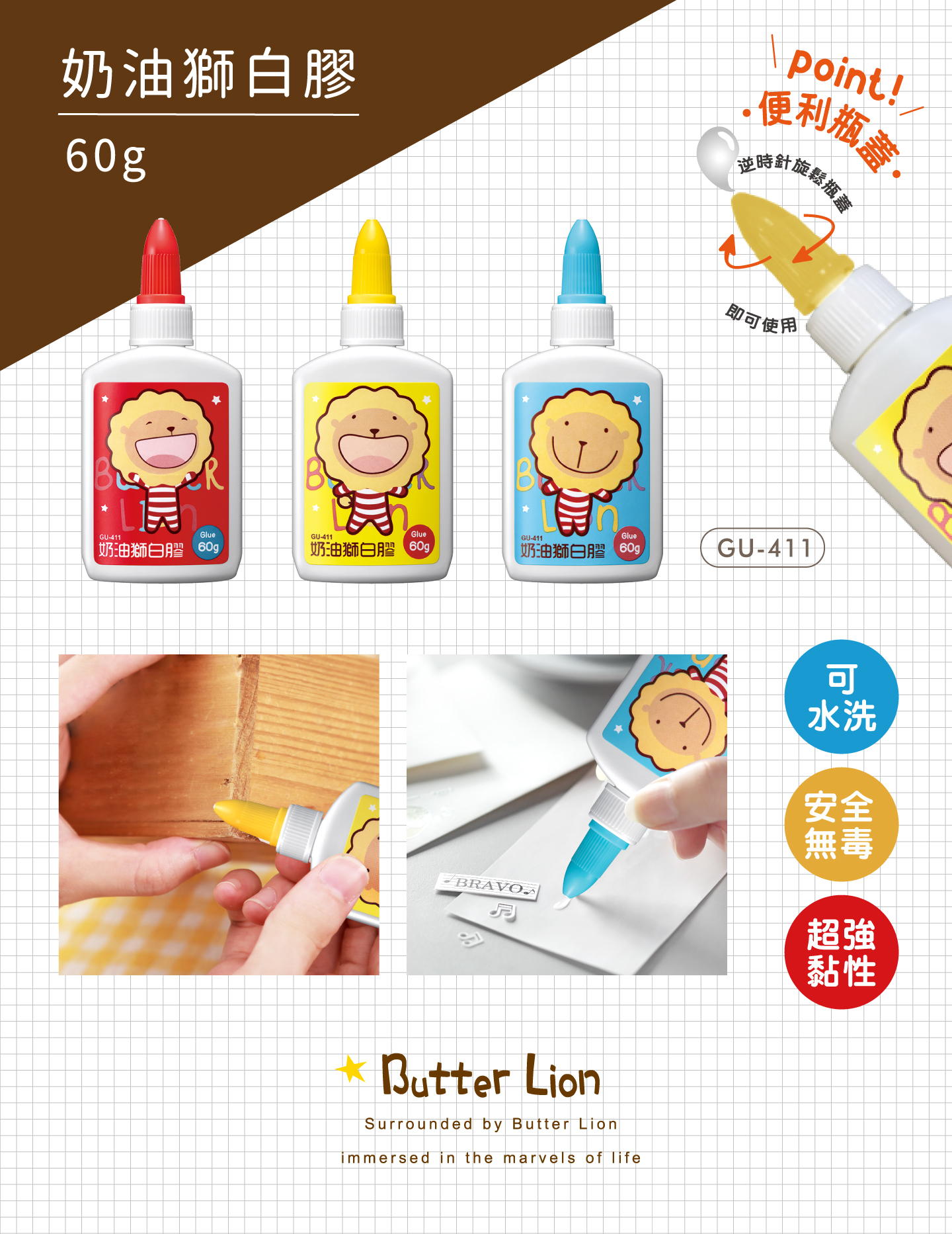 【奶油獅多用途白膠】乾燥速度快,具有超強的接著力;旋轉式接頭設計,按壓瓶身即可出膠,不沾手也能輕鬆使用;即使沾到皮膚,【奶油獅多用途白膠】可水洗,清理多餘殘膠超容易。