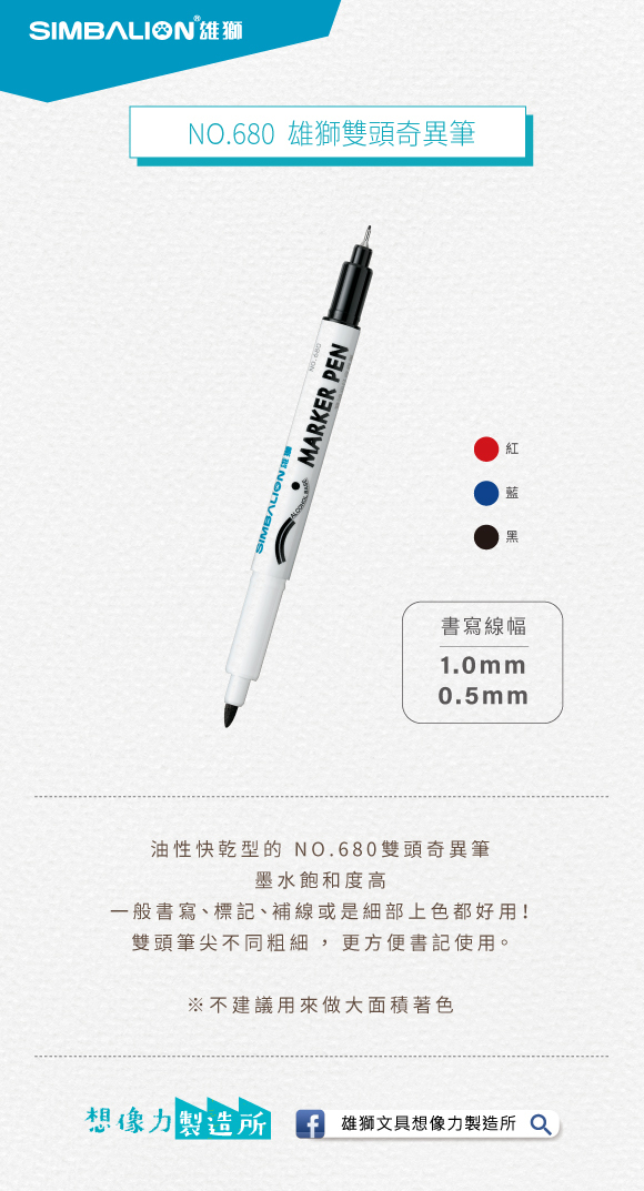 奇異筆的墨水飽和度比較高,屬油性快乾型,用以一般書寫、標記、補線或是細部上色都相當好用,但是不建議用來做大面積著色。雙頭筆尖不同粗細更方便書記使用。