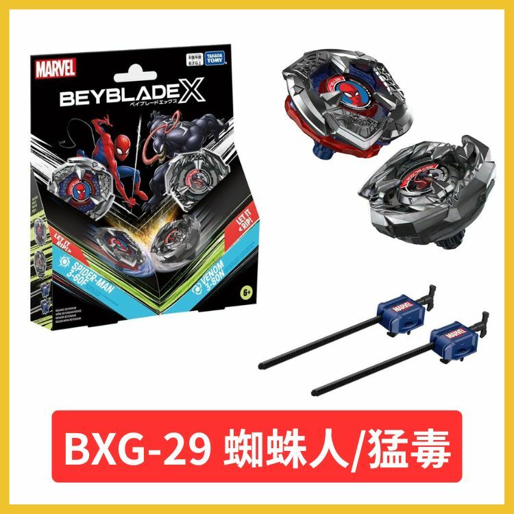 | 『BXG-29 蜘蛛人/猛毒雙重組合』商品內容: ※全新漫威聯名商品 ※內含兩顆陀螺,皆為全新設計 ※內附兩個發射器,皆有Marvel的特殊log |