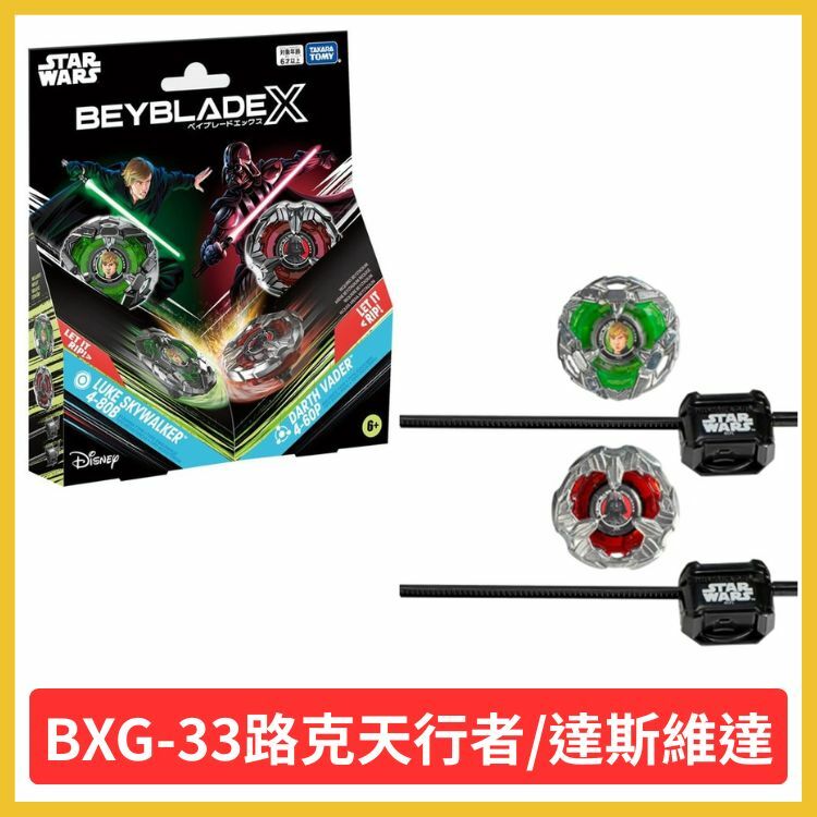 | 『BX-33路克天行者/達斯維達雙重組合』商品內容: ※全新星際大戰聯名商品 ※內含兩顆陀螺,皆為全新設計 ※內附兩個發射器,皆有STARWARS的特殊logo |