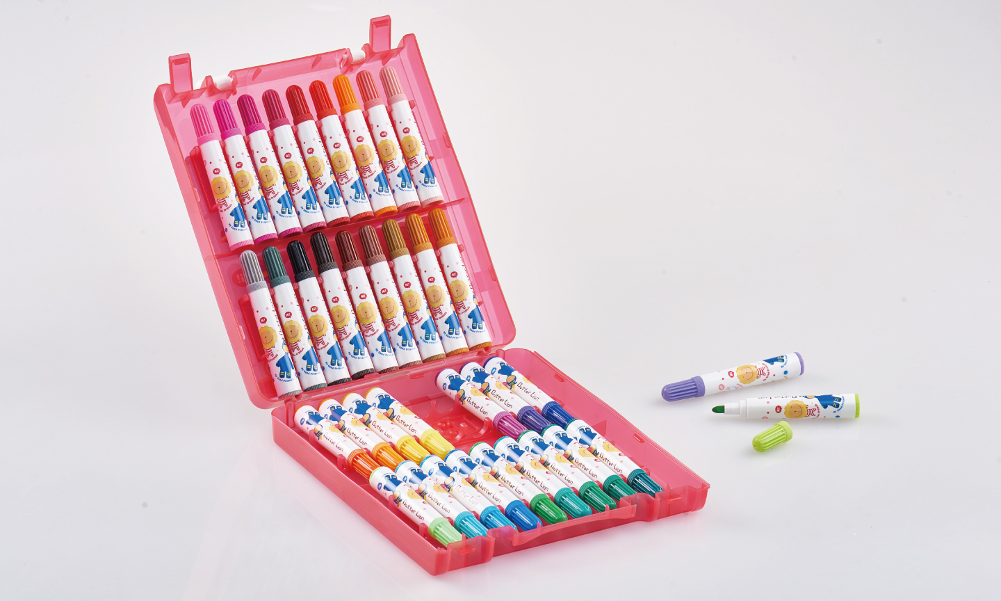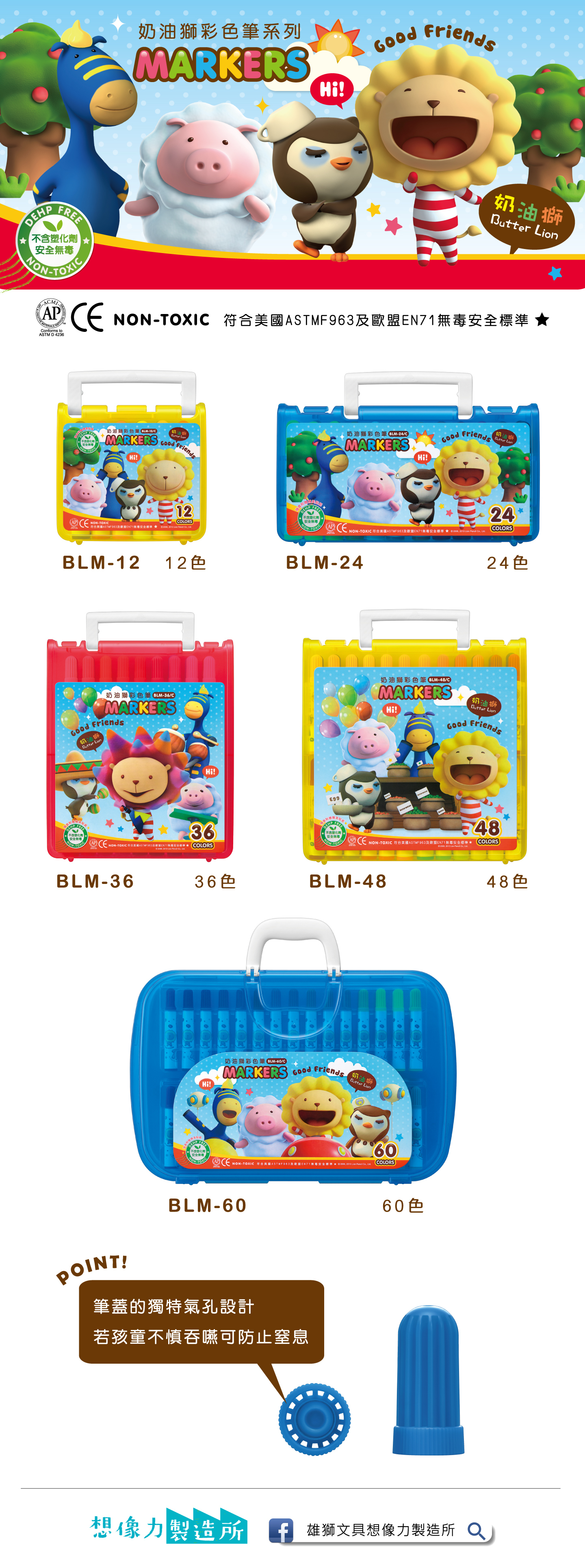 雄獅文具用心替消費者安全設想,外盒採無銳角安全設計,可收縮手提式把手不佔空間方便攜帶,讓小朋友走到哪畫到哪。產品都符合美國ASTM-D4236皮膚敏感性與接觸性測試,接觸後不會造成皮膚過敏反應,也不會造成任何任何副作用,擁有AP無毒標章認證。